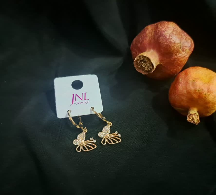 گوشواره پروانه ای نگین دار برند fashion رنگ ثابت، ضد حساسیت و کاملا سبک دارای نگین های اتمی رنگ طلایی